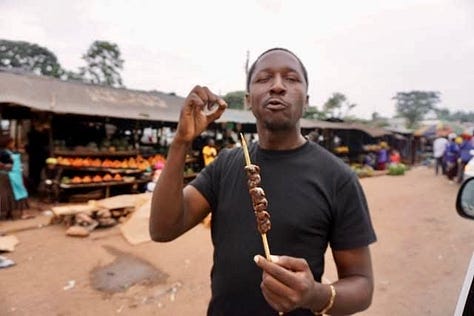 In Jinja, we paused briefly by the roadside for a comfort break. A row of shanty stalls greeted us, with delights for the passing trade. Women sat on the dusty floor selling piles of oranges. Stalls sold hot spicy maize, and Rolex - a flatbread rolled with vegetables. My curiosity led me to try a skewer of gizzard, a local delicacy with an acquired taste.