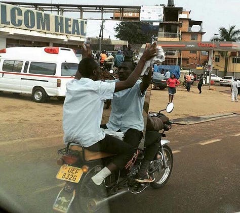 In contrast, we continued our journey through the vibrant pulse of Kampala. The streets buzzed with life: mopeds zipped past, piled impossibly high with sacks, crates, a mirror, people, and even the occasional goat, clinging on like a seasoned commuter. Street vendors called out from roadside stalls beneath concrete buildings. Women passed by, dressed in colourful clothes, some balancing goods on their heads.